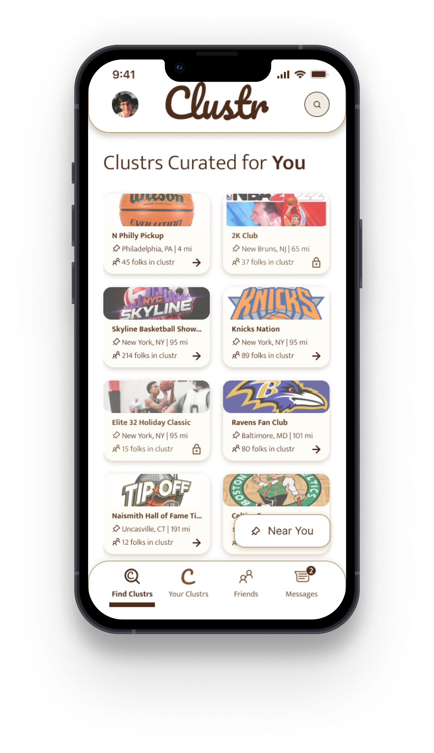 Clustr is a location-based social app designed to help people discover and join local communities centered around shared interests and experiences. Users can explore nearby “clustrs,” which are dynamic groups formed around events, hobbies, or activities, and connect with like-minded individuals before attending gatherings in person. The platform bridges the gap between digital connection and real-world socializing, making it easier for users to meet new people in a comfortable and meaningful way.